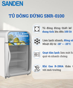 Tủ đông Sanden SNR-0100 với thiết kế đứng 1 cánh nhỏ gọn và dung tích 100 lít được ứng dụng rộng rãi trong nhiều ngành nghề khác nhau nhờ khả năng làm lạnh nhanh, tiết kiệm điện và vận hành ổn định.