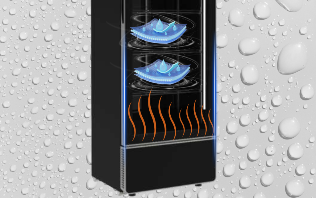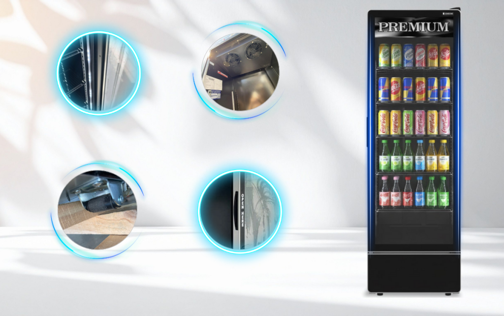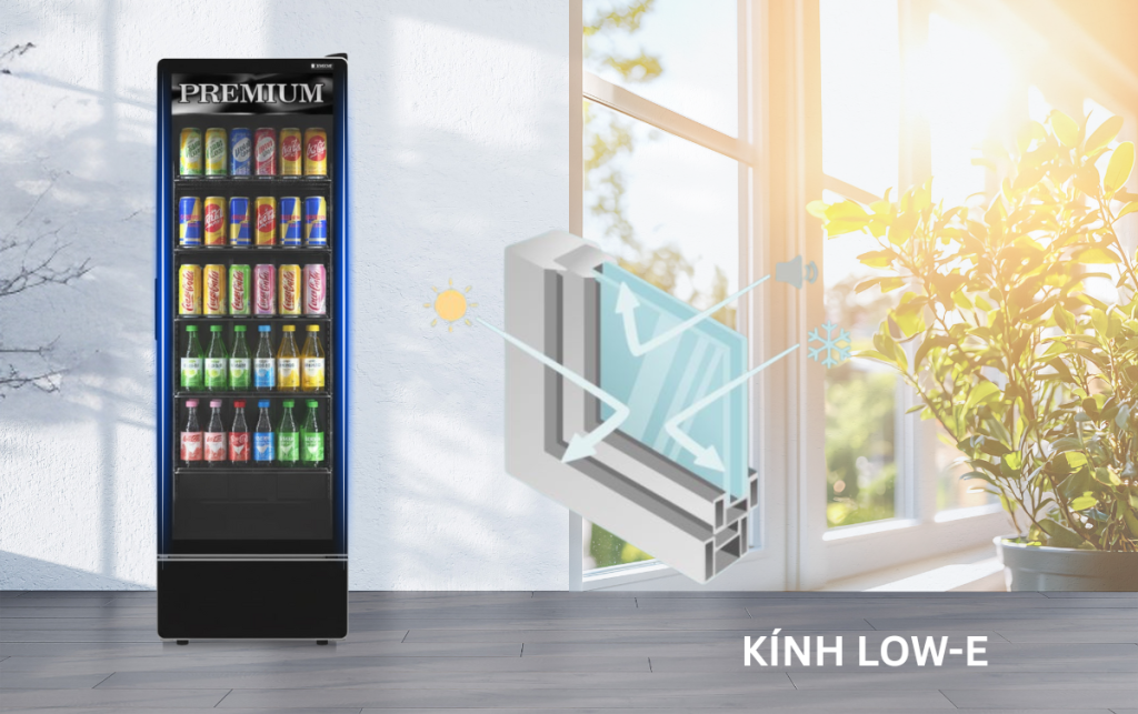 Cửa kính LOW E hai lớp không chỉ có khả năng chống đọng sương hiệu quả mà còn giúp duy trì nhiệt độ tối ưu bên trong tủ nhờ khả năng cách nhiệt ưu việt. Mặt kính sáng bóng càng làm nổi bật các sản phẩm trưng bày bên trong tủ, góp phần thu hút sự chú ý của khách hàng khi bước vào cửa hàng. Thiết kế tràn viền còn mang đến cảm giác liền mạch, thanh thoát, tạo hiệu ứng thị giác tinh tế và sang trọng, đồng thời dễ dàng vệ sinh, bảo dưỡng.